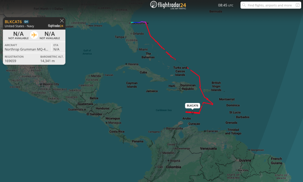 Un drone de surveillance maritime Northrop Grumman MQ-4C Triton , qui a décollé de la base navale de Mayport à Jacksonville en Floride, est repéré au large du Venezuela ce matin.